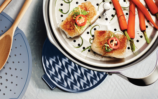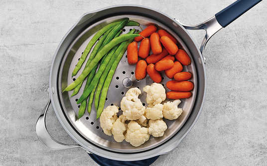 An integrated accessory that sits inside the pan, ideal for easily steaming vegetables and other foods for healthier preparation.