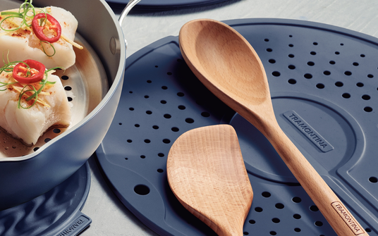 versatile silicone piece that acts as a trivet to protect your table or as an extra layer of heat protection for the pan handles.