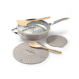 Each set includes a unique aluminum lid with a stainless steel handle that doubles as a spoon rest, a convenient nesting steamer insert, 2 wooden utensils, a folding silicone frying screen to use your task in the kitchen and a silicone pot holder that’s perfect for taking the pan directly from kitchen to table.
