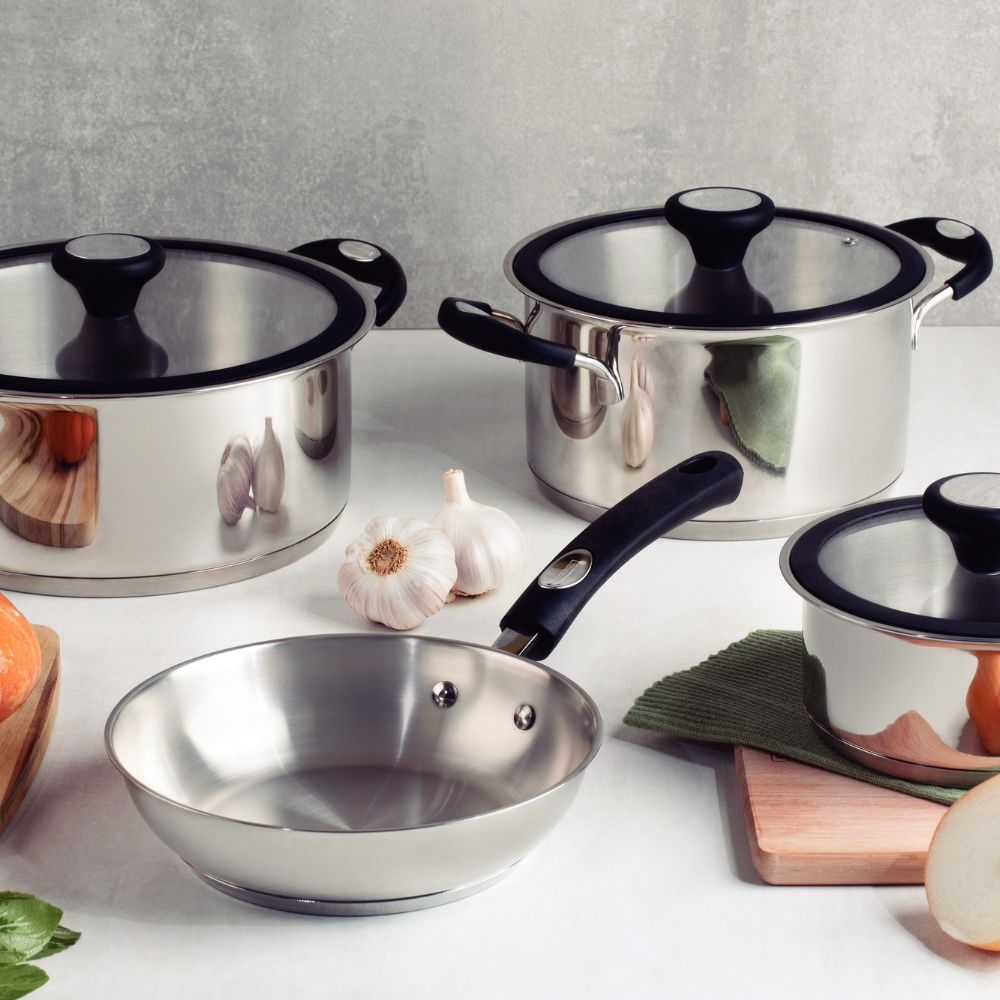 Stainless Steel With Tri-Ply Base (Stainless Steel + Aluminum + Stainless Steel) And Silicone Handle