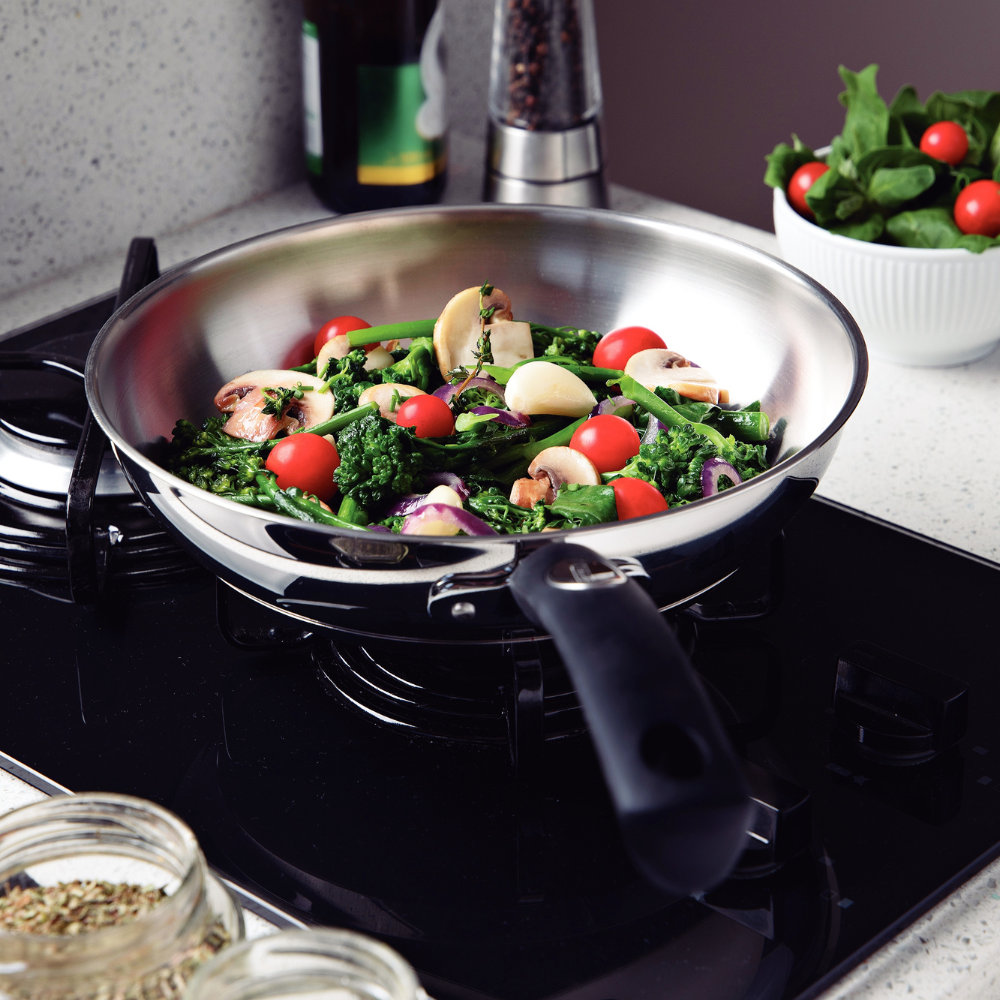 with 3-ply base construction (stainless steel + aluminium + stainless steel), which distributes the heat evenly throughout the base of the pan for faster cooking, and saves energy by keeping the heat low while cooking.