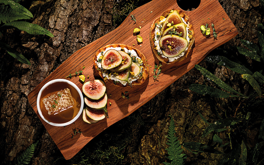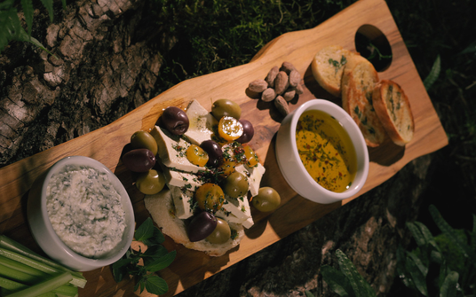 its natural wood finish and fluid design make it an elegant, perfect for beautifully presenting and sharing appetizers, cheeses, and other foods directly at the table.