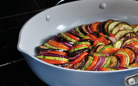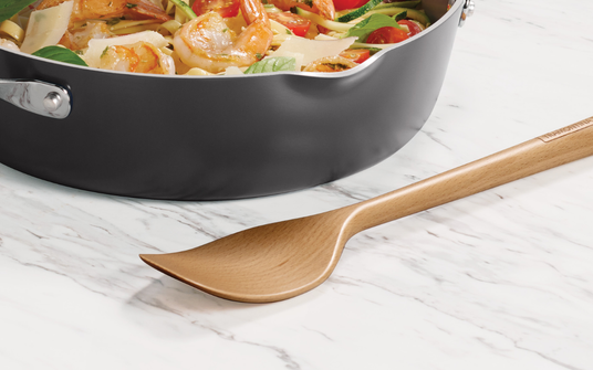 which is ideal for stirring and serving without scratching the pan's ceramic nonstick interior.