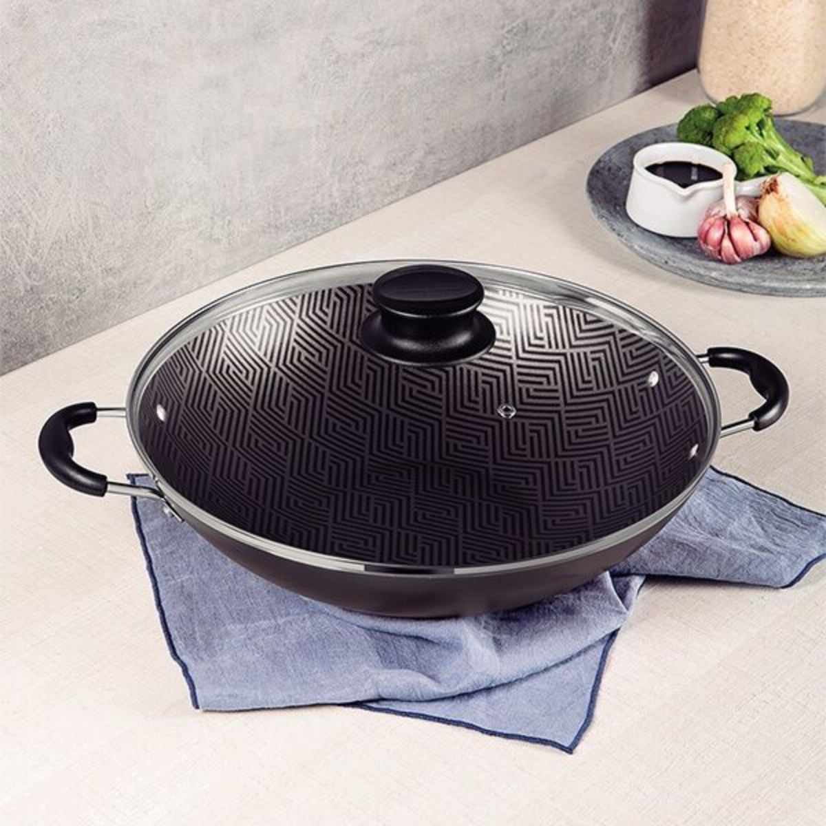 The Tramontina Paris aluminum wok with interior and exterior Starflon Max read nonstick coating with a glass lid, 32 centimeter 4,4 liter, is essential for anyone who loves to cook with practicality, without giving up style. It is produced in aluminum with an interior and exterior Starflon Max nonstick coating, characteristics that together provide fast and uniform cooking of food and prevent it from sticking to its surface. It comes with a tempered glass lid and it has heat-resistant Bakelite handles and a nylon knob, two materials that do not heat up and offer better handling. In addition to all these features, it is very easy to wash, as it can be washed in the dishwasher. Choose Tramontina and see your kitchen be transformed!