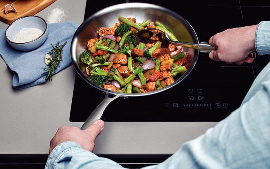 with 3-ply clad construction (stainless steel + aluminium + stainless steel), which distributes the heat evenly throughout the body of the pan for faster cooking, and saves energy by keeping the heat low while cooking.