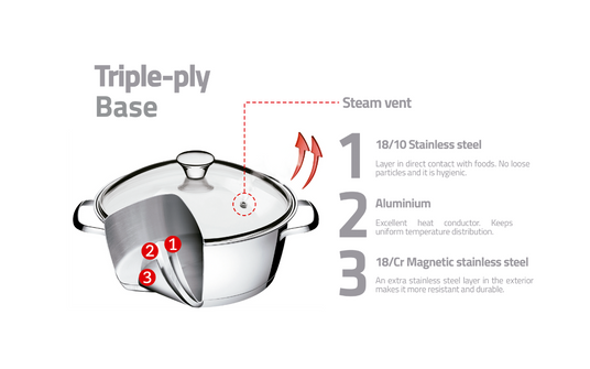 with 3-ply base construction (stainless steel + aluminium + stainless steel), which distributes the heat evenly throughout the base of the pan for faster cooking, and saves energy by keeping the heat low while cooking.
