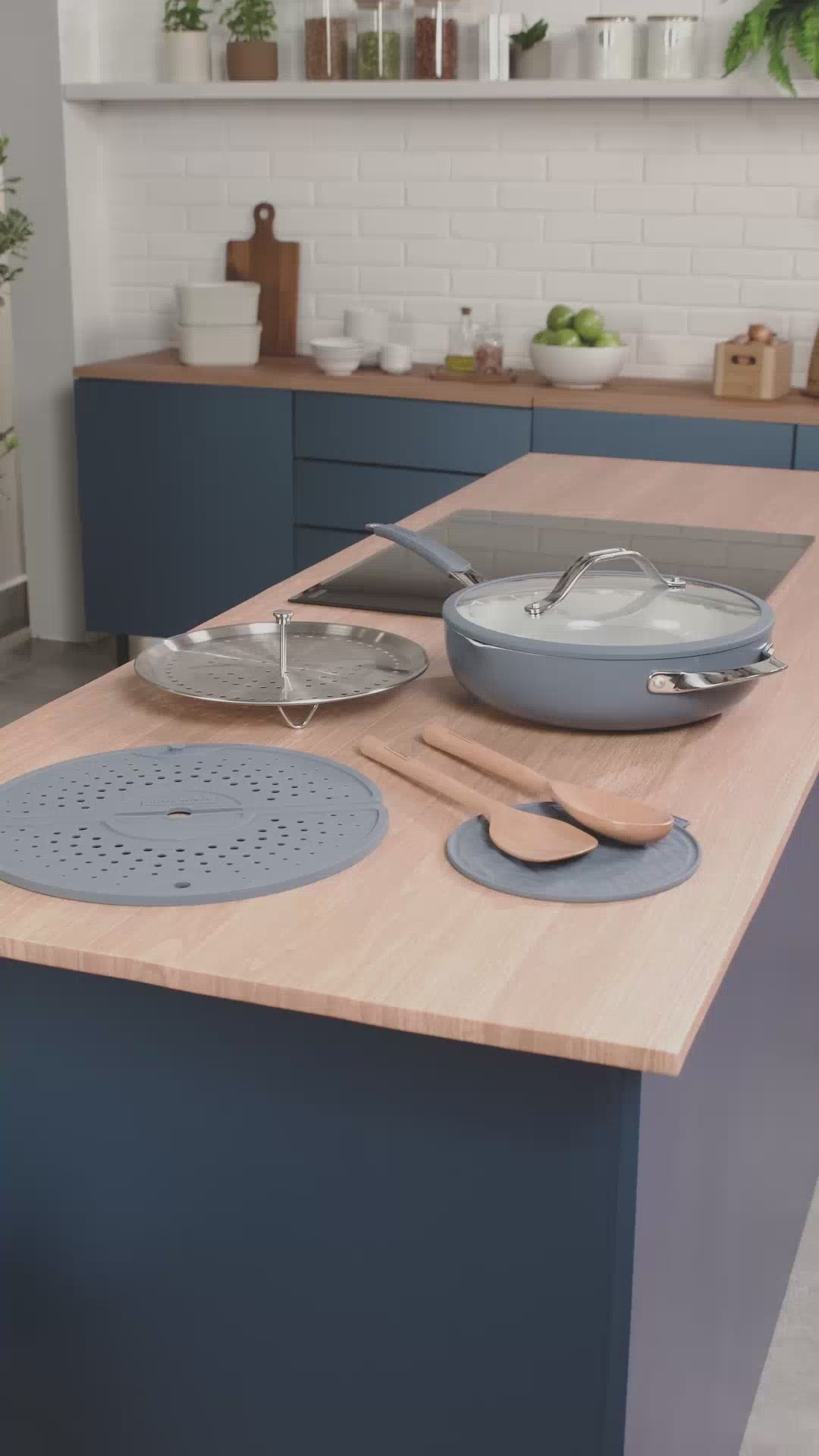 Each set includes a unique aluminum lid with a stainless steel handle that doubles as a spoon rest, a convenient nesting steamer insert, 2 wooden utensils, a folding silicone frying screen to use your task in the kitchen and a silicone pot holder that’s perfect for taking the pan directly from kitchen to table.