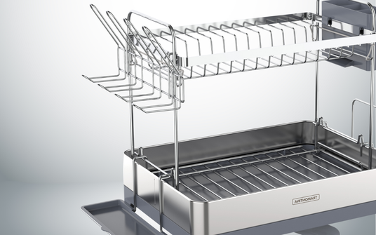 utilizes vertical space with a dedicated top shelf for plates and a bottom shelf for bowls, allowing you to dry more dishes while occupying a minimal counter footprint.