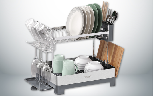 Keep your kitchen neat and organized with the Tramontina 2-Tier Stainless Steel Dish Rack. Designed to maximize counter space, it features a two-tier design with a top shelf for plates and a bottom shelf for bowls, allowing for efficient dish organization. The versatile storage system includes a 2-tier cup holder for mugs and wine glasses with a built-in drip tray to prevent water pooling, as well as a utensil holder and a dedicated cutting board holder to keep everything in place. Made from durable stainless steel and sturdy polypropylene, this dish rack is built to last. A built-in drainboard helps direct water away from your counter, and the sturdy plastic base keeps it stable while you load and unload dishes.
