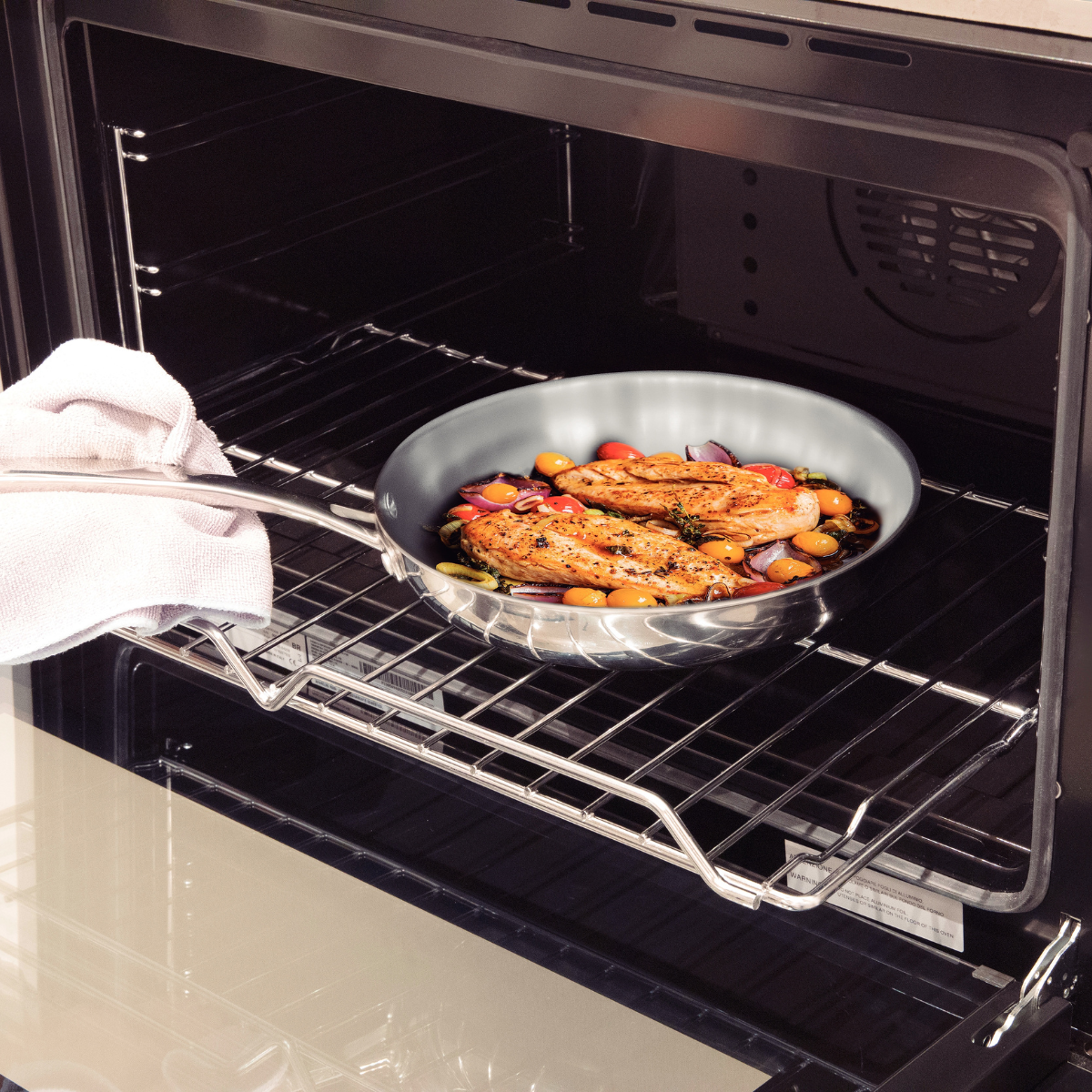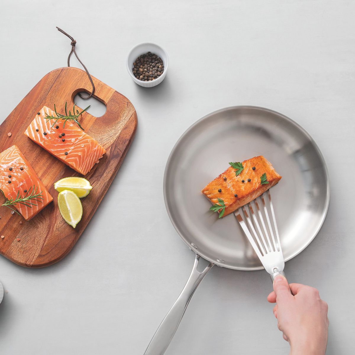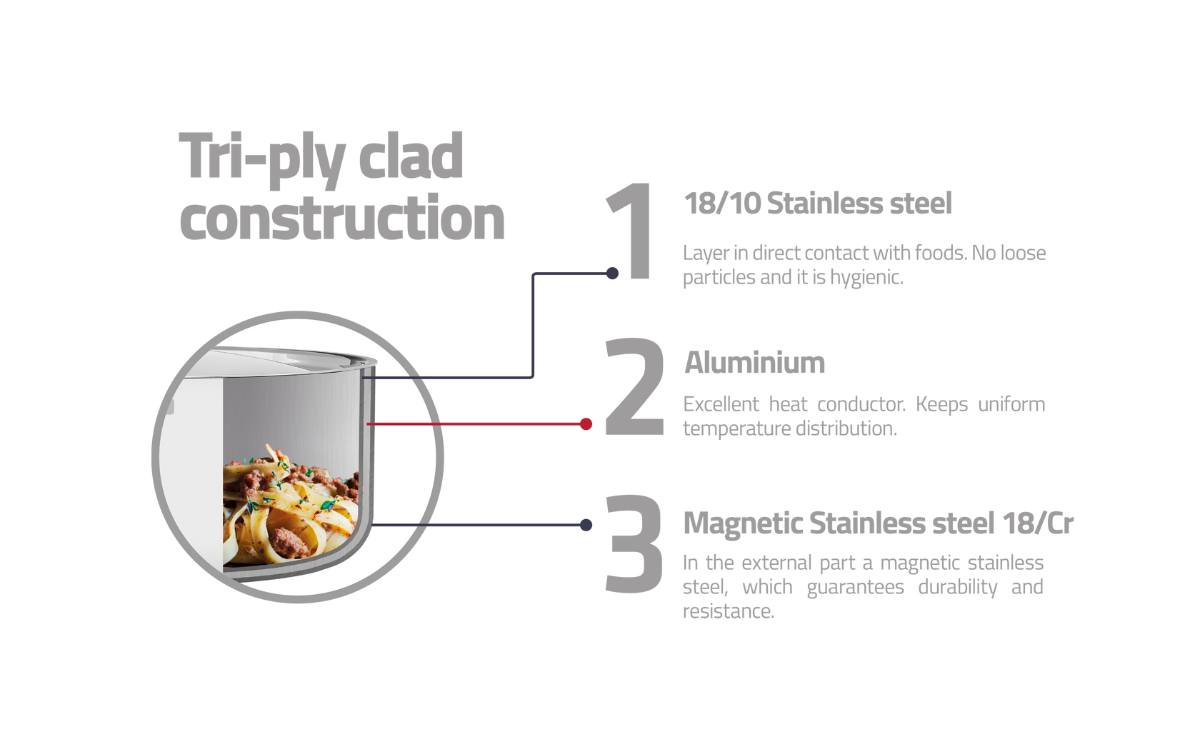 with 3-ply clad construction (stainless steel + aluminium + stainless steel), which distributes the heat evenly throughout the body of the pan for faster cooking, and saves energy by keeping the heat low while cooking.