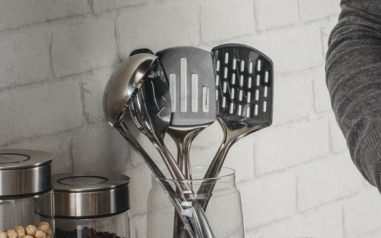 with a hole in the handle that allows the utensil to be hung on hooks, racks, or wall-mounted organizers, saving valuable drawer or countertop space.