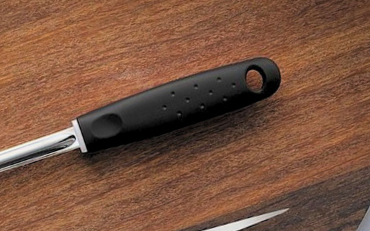 with a hole in the handle that allows the utensil to be hung on hooks, racks, or wall-mounted organizers, saving valuable drawer or countertop space.