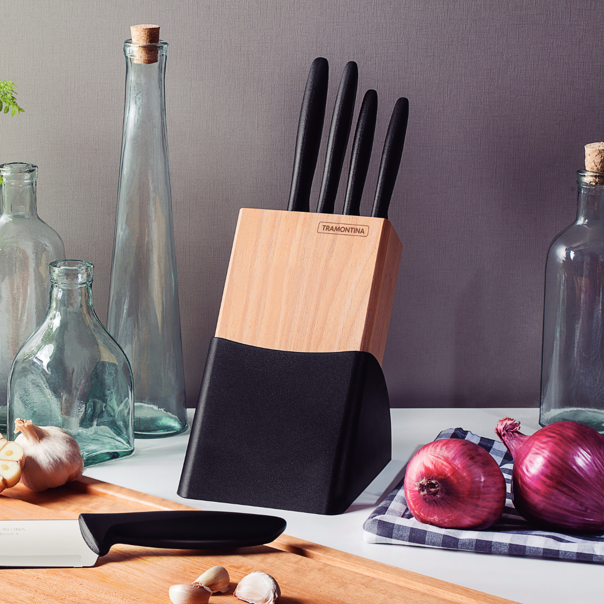 You will impress your guests with the Tramontina Plenus 6-piece knife set with stainless steel blades, black polypropylene handles and wood block. The five pieces are made with black polypropylene handles and stainless steel blades, which are sturdy, easy to handle and dishwasher-safe. Versatile and featuring a modern design, they are suitable for different uses. They can be used for simple to more elaborate types of preparation. The knife set is the ideal choice to further embellish your environment!